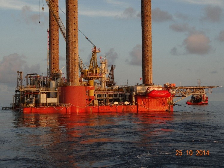 Longitude’s personnel were in attendance offshore to witness the deconstruction of the WHS and the successful lift of the WHS (with xmas trees and conductors remaining in place). The above photograph illustrates the WHS being lifted off. Longitude was involved in the execution of the MOPU removal which involves re-floating a jack-up rig that has be on station for 8 years. Next few pages describe the main issues during re-floating of the MOPU.