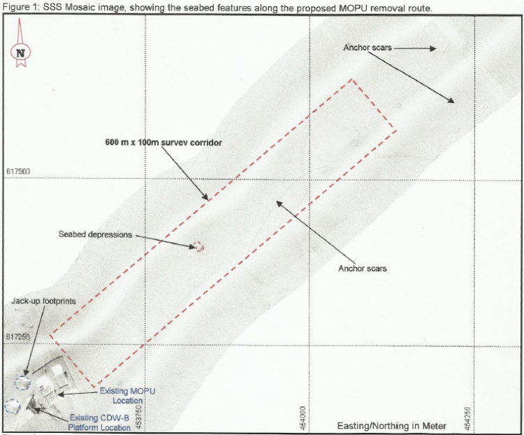 Seabed scan is to be carried out along MOPU removal route. Location suitable for mat deployment is to be defined.