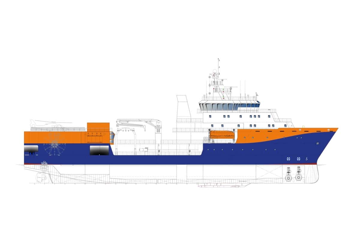 The OSD-IMT2007 Seismic Research vessel is designed primarily for Seismic survey activities. Large gun and streamer stowage’s and reels are located aft and a helipad is located above. A high towing capability is provided by twin azimuth propulsion thrusters and with two bow thrusters to provide a high station keeping capability. The vessel is fitted with a side “A” frame for water column and seabed sampling. A Seabed mapping capability is also provided by gondola mounted sensors.