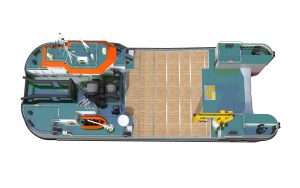 It has a convenient 240 m2 deck space with high capacity roller over the bow and a towing arrangement over the stern. In addition, the generously sized sleeping cabins are all above the waterline.