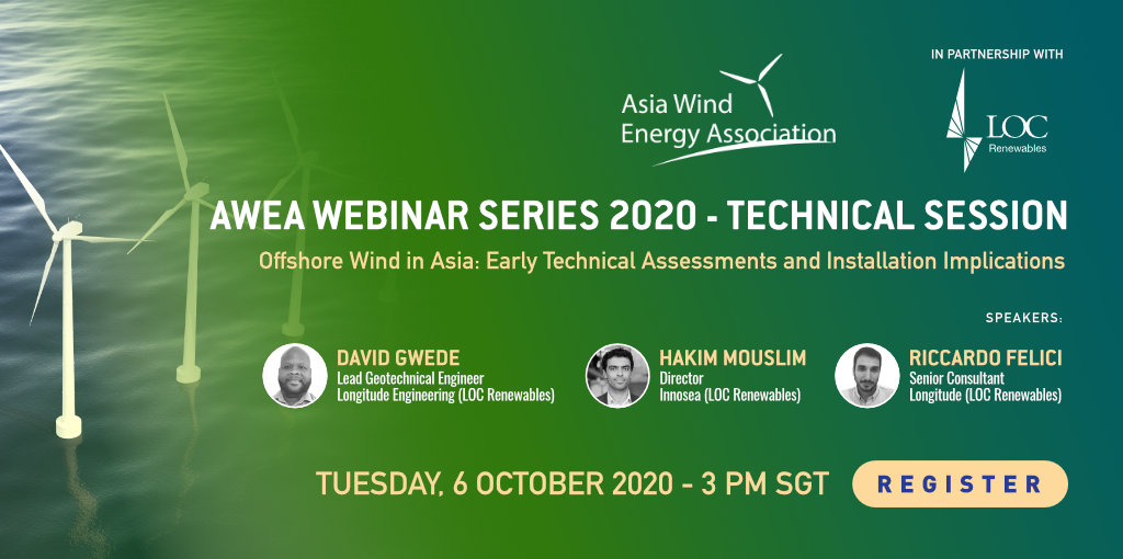 LOC Renewables – the sector-focussed initiative combining marine and engineering expertise of LOC, Longitude Engineering and Innosea – is pleased to announce it will be presenting a Technical Session on ‘Offshore Wind in Asia: Early Technical Assessments and Installation Implications’, in partnership with Asia Wind Energy Association (‘AWEA’).